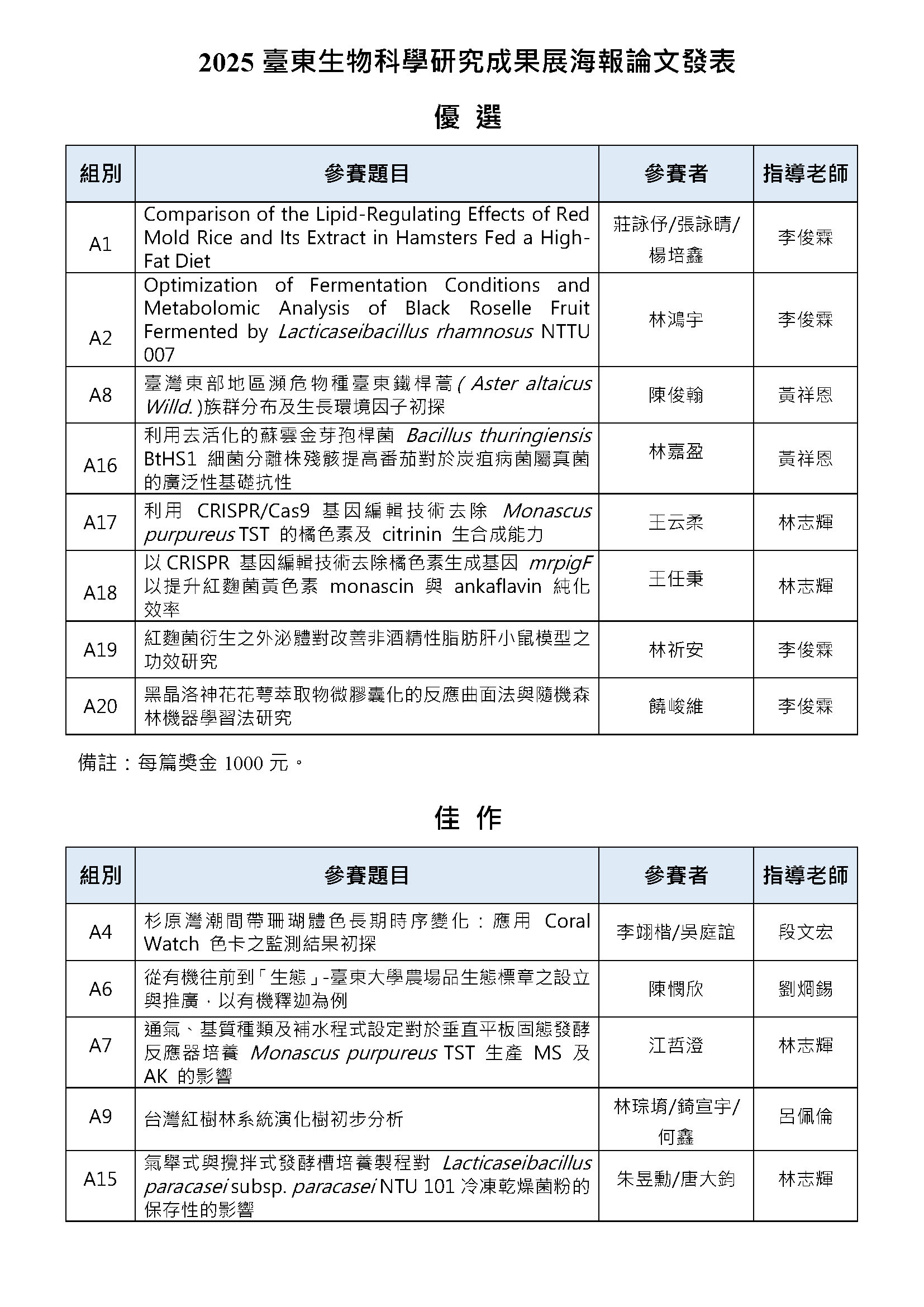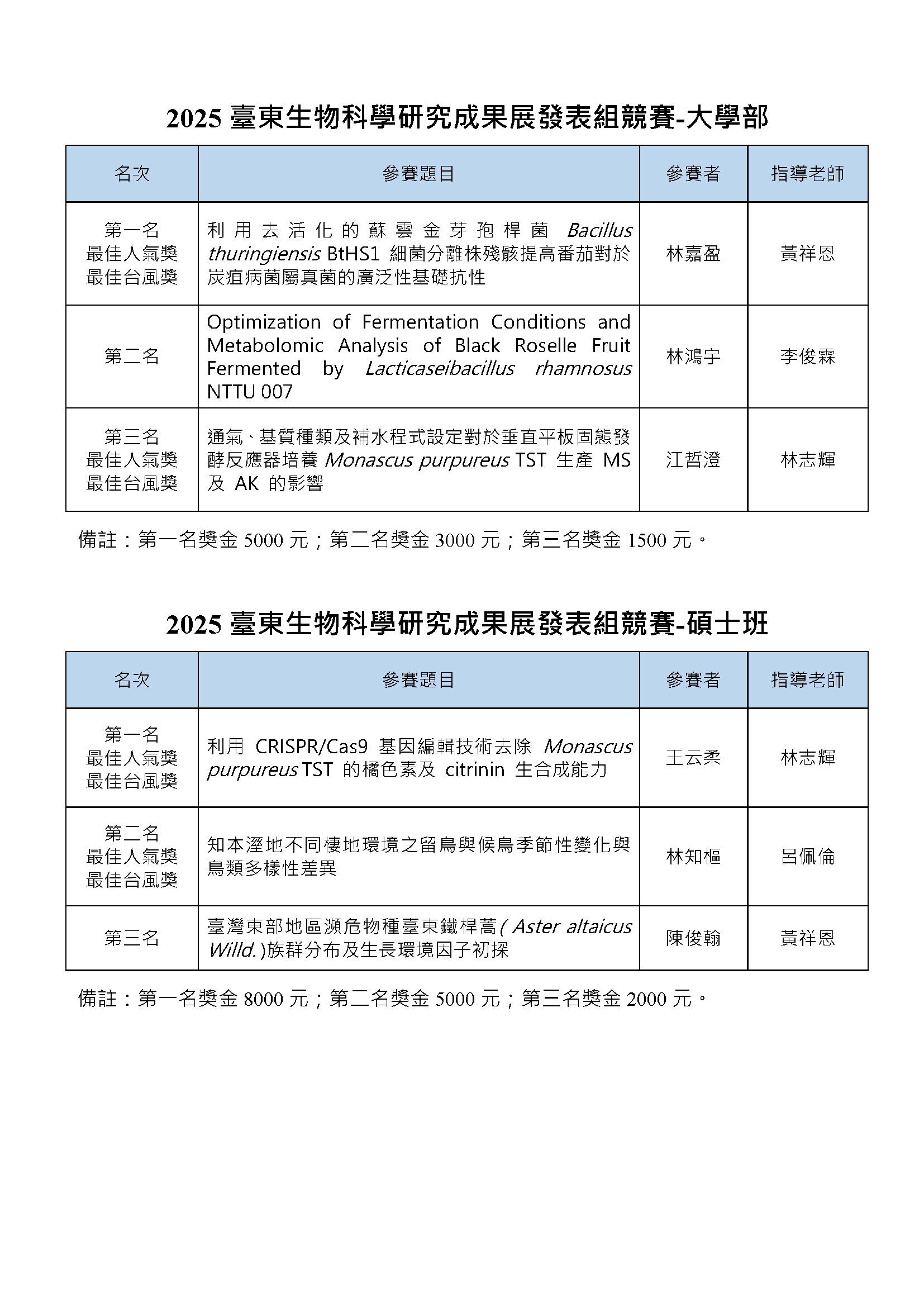 【生科系】2025臺東生物科學研究成果展成績公告